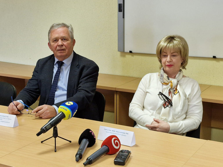 Zľava: Prezident Slovenskej urologickej spoločnosti a prednosta urologickej kliniky FNsP J. A. Reimana v Prešove Ivan Minčík a hlavná odborníčka Ministerstva zdravotníctva SR pre rádiológiu Viera Lehotská počas brífingu FNsP J. A. Reimana pri príležitosti medzinárodného diagnostického workshopu pod názvom Cielená biopsia prostaty vo Fakultnej nemocnici J. A. Reimana v Prešove. Prešov, 21. marec 2024. Foto: SITA/Ivan Kriššák