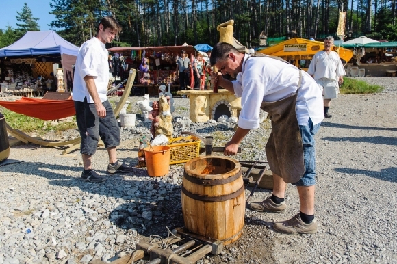 Remeselníci Milan Zemanovič (vľavo) a Peter Gembeš (vpravo) predvádzajú výrobu suda počas 51. ročníka Medzinárodného folklórneho festivalu Jánošíkove dni. Terchová, 26. júl 2013. Foto: SITA/Milo Fabian