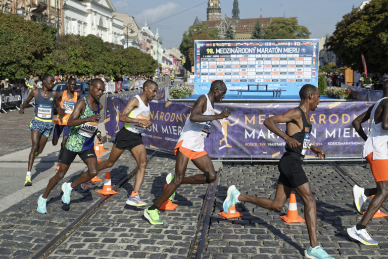 Sprava: Bežci Henok Tesfay (Eritrea), Jackson Kiprop (Uganda), Deribe Robi (Etiópia), Hiribo Shano (Etiópia), Reuben Kiprop Kerio (Keňa) a Albert Kipkosgei Kangogo (Keňa) počas 98. ročníka Medzinárodného maratónu mieru v Košiciach. Košice, 3. október 2021. Foto: SITA/Ivan Fleischer