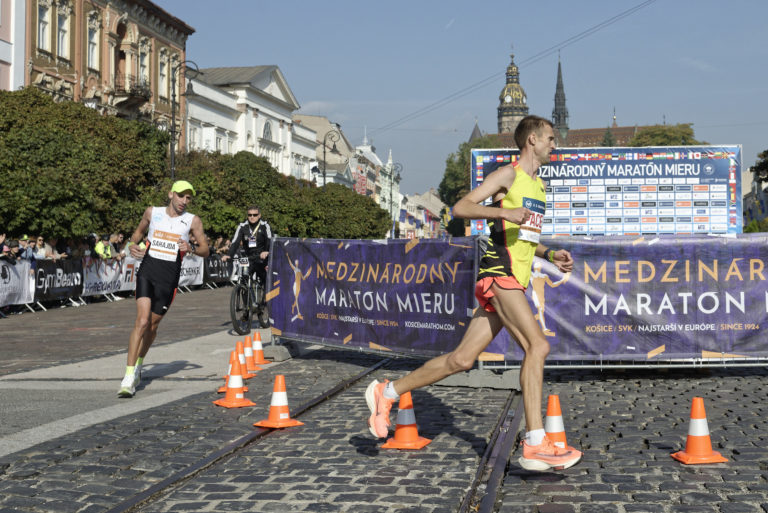 Bežec Tibor Sahajda (Slovensko) (vľavo v popredí) počas 98. ročníka Medzinárodného maratónu mieru v Košiciach. Košice, 3. október 2021. Foto: SITA/Ivan Fleischer
