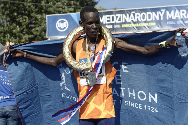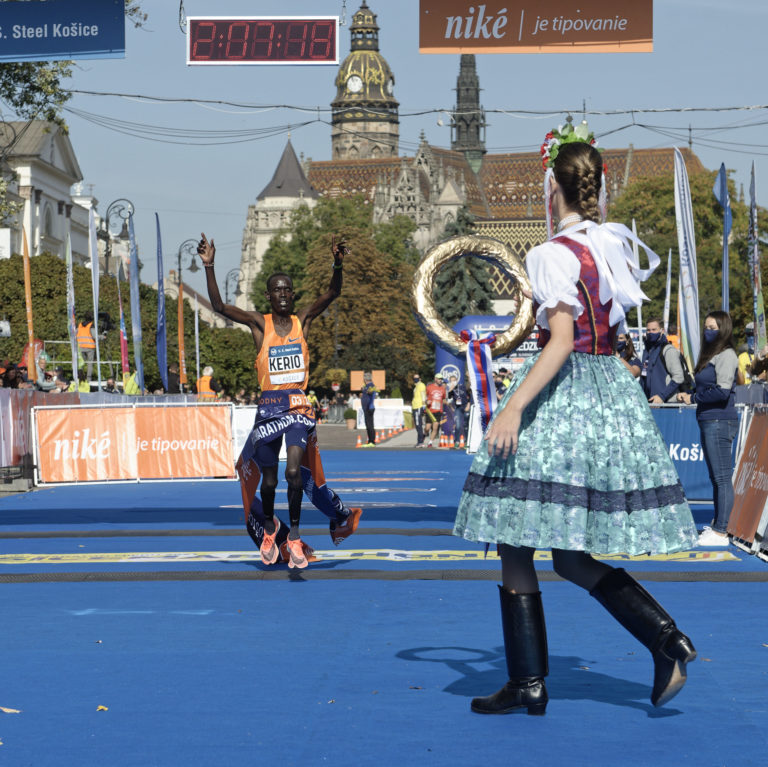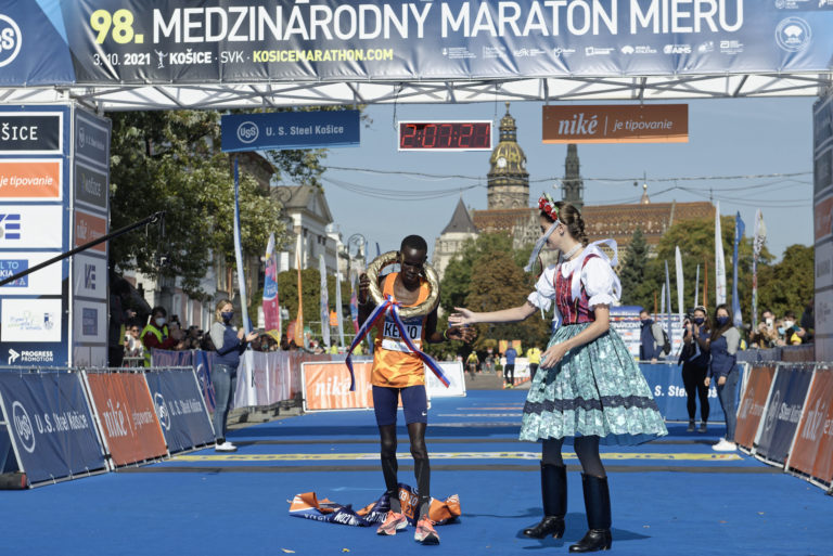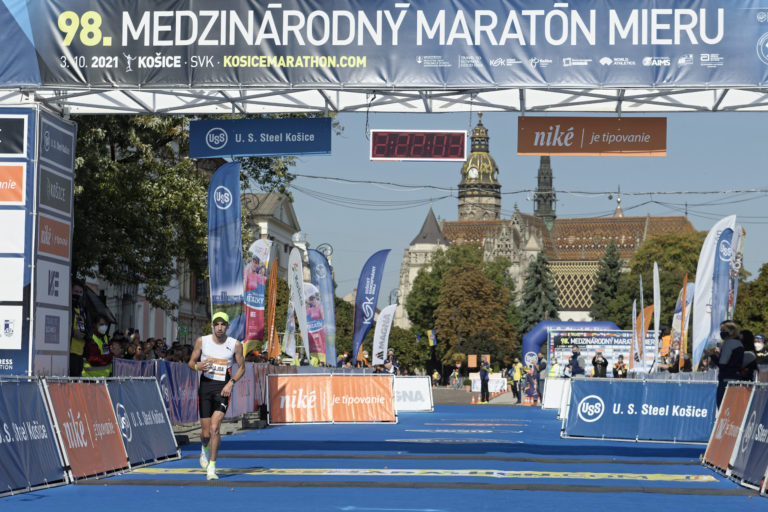 Bežec Reuben Kiprop Kerio (Keňa) dobieha prvý do cieľa počas 98. ročníka Medzinárodného maratónu mieru v Košiciach. Košice, 3. október 2021. Foto: SITA/Ivan Fleischer