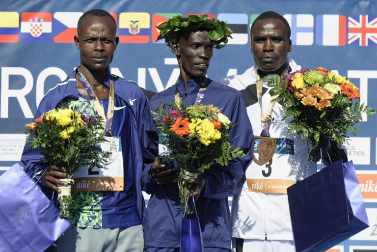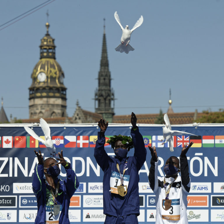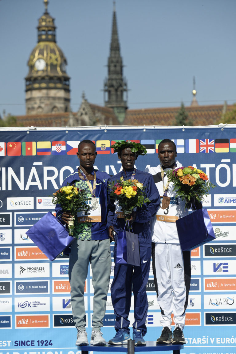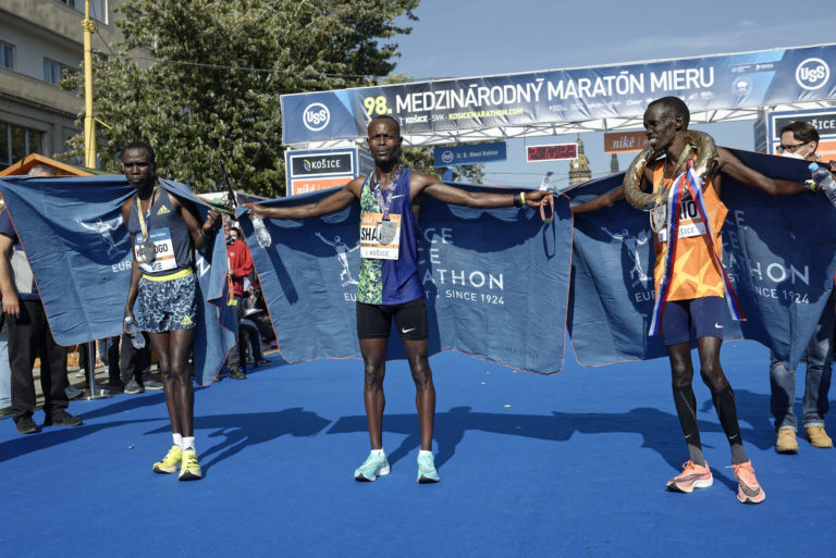 Zľava: Najrýchlejší bežci na stupni víťazov Albert Kipkosgei Kangogo (Keňa), Reuben Kiprop Kerio (Keňa) a Hiribo Shano Share (Etiópia) počas 98. ročníka Medzinárodného maratónu mieru v Košiciach. Košice, 3. október 2021. Foto: SITA/Ivan Fleischer