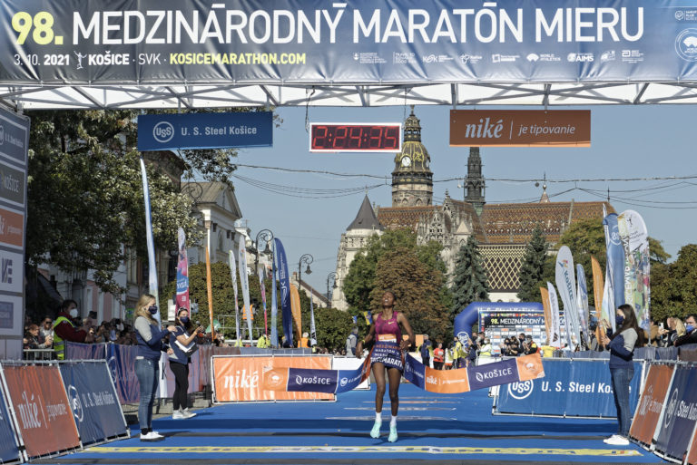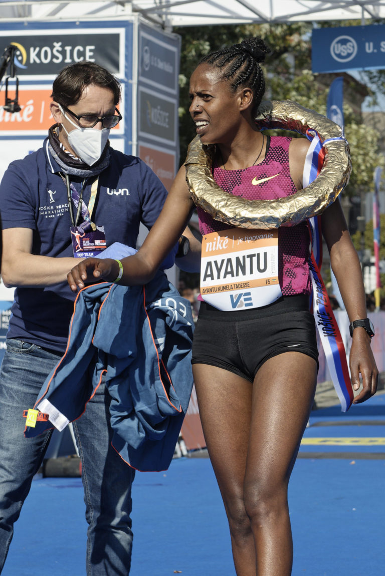 Bežkyňa Ayantu Kumela Tadesse (Etiópia) vytvára ženský traťový rekord v cieli počas 98. ročníka Medzinárodného maratónu mieru v Košiciach. Košice, 3. október 2021. Foto: SITA/Ivan Fleischer