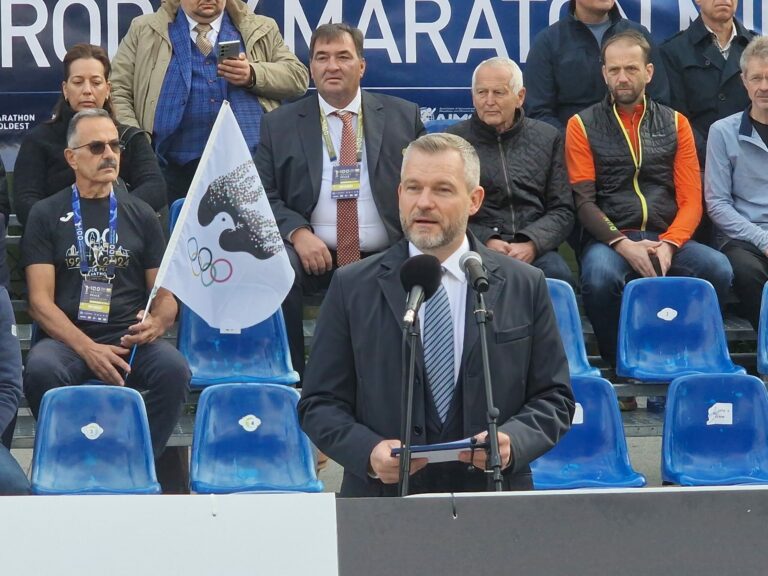 Prezident SR Peter Pellegrini (uprostred) počas uvítacieho prejavu v rámci Medzinárodného maratónu mieru 2024. Košice, 6. október 2024. Foto: SITA/Ivan Kriššák