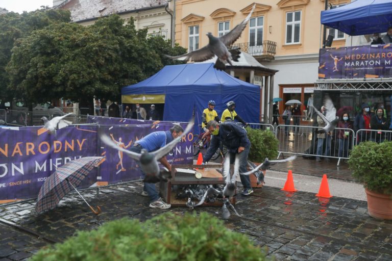 Vypustenie holubov počas štartu 97. ročníka Medzinárodného maratónu mieru v Košiciach. Košice, 4. október 2020. Foto: SITA/Marek Lukáč