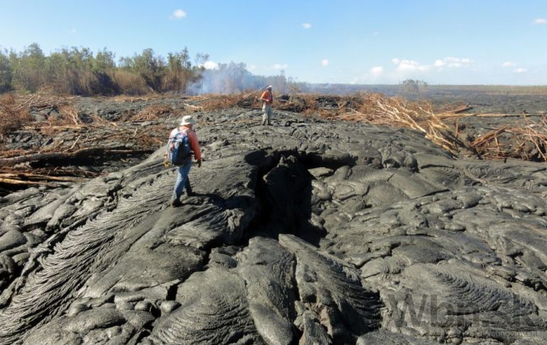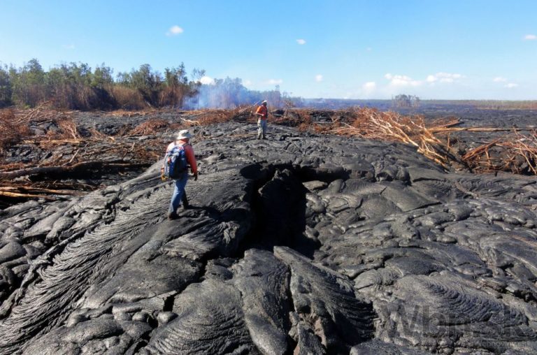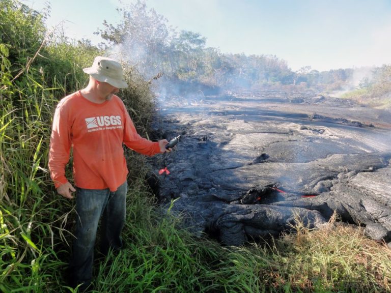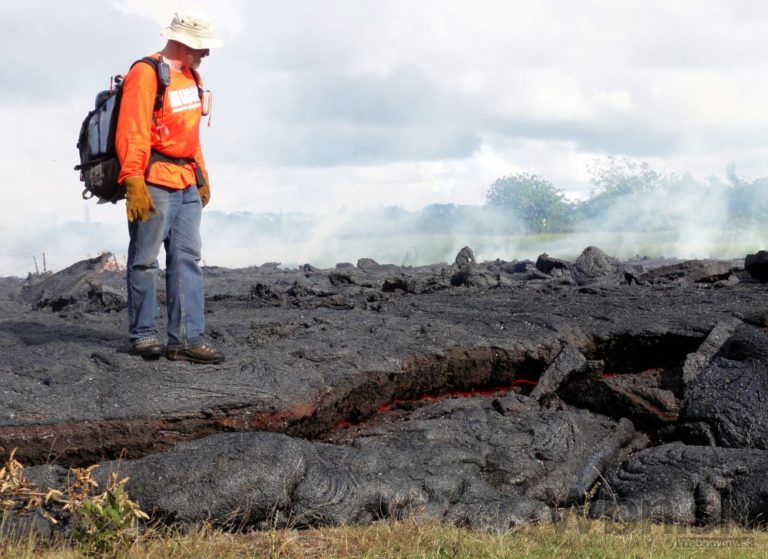 Láva vytekajúca z havajskej sopky Kilauea sa blíži k mestečku Pahoa a nachádza sa už len asi 100 metrov od obývanej oblasti. Úrady vyzvali ľudí, aby sa pripravili na evakuáciu. Na snímke: Geológ skúma lávu. Havaj, 26. októbra 2014. Foto: SITA/AP