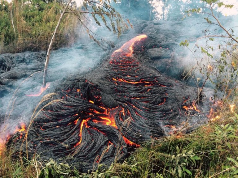 Snímka z 15. septembra 2014 ukazuje, ako láva vyteká z havajskej sopky Kilauea. Láva sa blíži k mestečku Pahoa a nachádza sa už len asi 100 metrov od obývanej oblasti. Úrady vyzvali ľudí, aby sa pripravili na evakuáciu. Havaj, 26. októbra 2014. Foto: SITA/AP