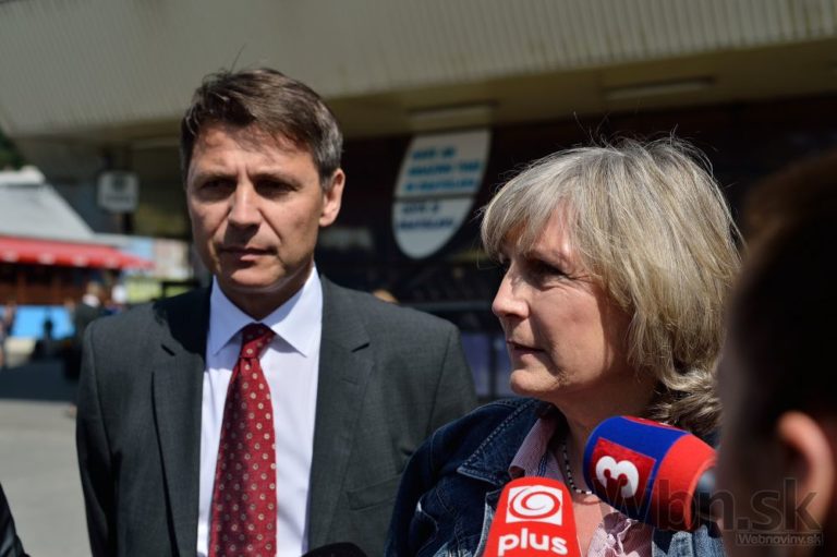Dopravná inžinierka Bratislavy Tatiana Kratochvílová a primátor mesta Bratislava Ivo Nesrovnal počas krátkeho brífingu ku kontrolnému dňu prác na Hlavnej stanici - Námestí Franza Liszta a prezentácie jednotlivých etáp plánovaných prác. Bratislava, 18. jún 2015. Foto: SITA/Robert Tappert