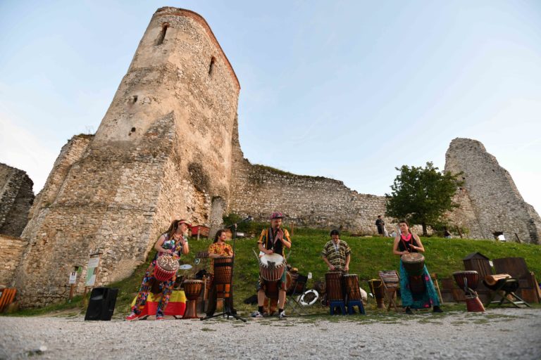 Vystúpenie skupiny Jamadan - Rytmy Afriky pred začiatkom pozorovania nočnej oblohy a meteorického roja Perzeíd na Čachtickom hrade. Čachtice, okr. Nové Mesto nad Váhom, 12. august 2023. Foto: SITA/Martin Medňanský.