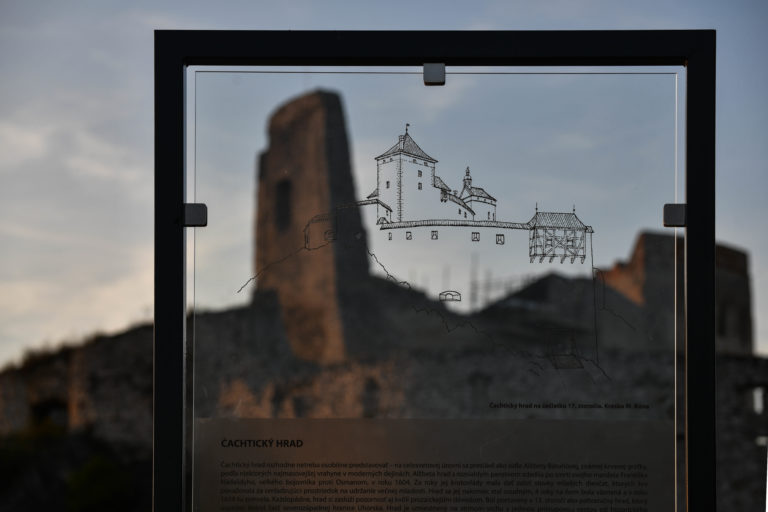 Pohľad na Čachtický hrad cez informačnú tabuľu s nákresom hradu pred začiatkom pozorovania nočnej oblohy a meteorického roja Perzeíd na Čachtickom hrade. Čachtice, okr. Nové Mesto nad Váhom, 12. august 2023. Foto: SITA/Martin Medňanský.