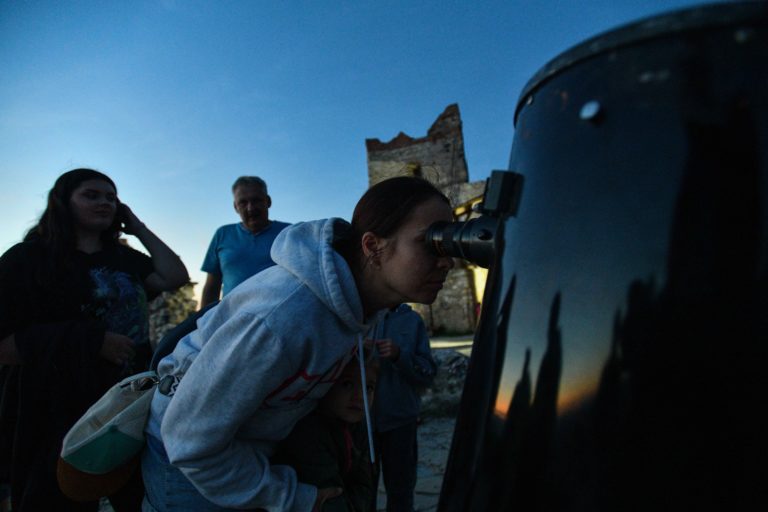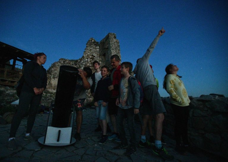 Návštevníci pozorujú nočnú oblohu cez zrkadlový ďalekohľad počas pozorovania nočnej oblohy a meteorického roja Perzeíd na Čachtickom hrade. Čachtice, okr. Nové Mesto nad Váhom, 12. august 2023. Foto: SITA/Martin Medňanský.
