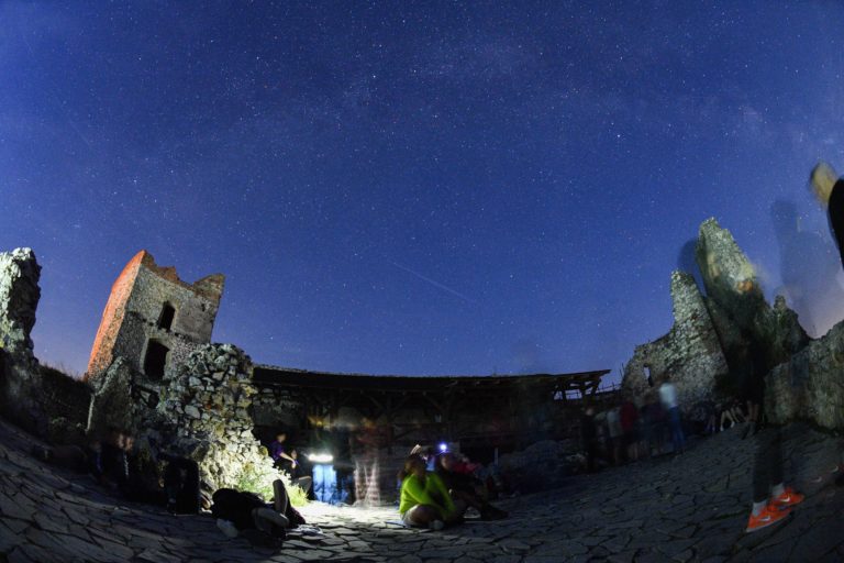 Návštevníci pozorujú nočnú oblohu a meteorický roj Perzeíd na Čachtickom hrade. Čachtice, okr. Nové Mesto nad Váhom, 12. august 2023. Foto: archívne, SITA/Martin Medňanský.