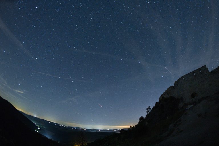 Pohľad na nočnú oblohu počas pozorovania nočnej oblohy a meteorického roja Perzeíd na Čachtickom hrade. Čachtice, okr. Nové Mesto nad Váhom, 12. august 2023. Foto: SITA/Martin Medňanský.
