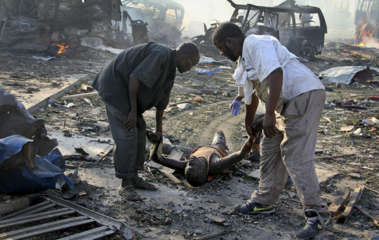 Somálskym hlavným mestom Mogadišo otriasol v sobotu silný výbuch. Podľa bezpečnostných predstaviteľov na rušnej ulici pred hotelom v štvrti Hodan explodovalo nákladné auto naložené výbušninami. Očití svedkovia tvrdia, že nálože v aute odpálil samovražedný atentátnik. Podľa ich údajov išlo o najsilnejší výbuch v meste za posledné roky. Mogadišo, 14. október 2017. Foto: SITA/AP.