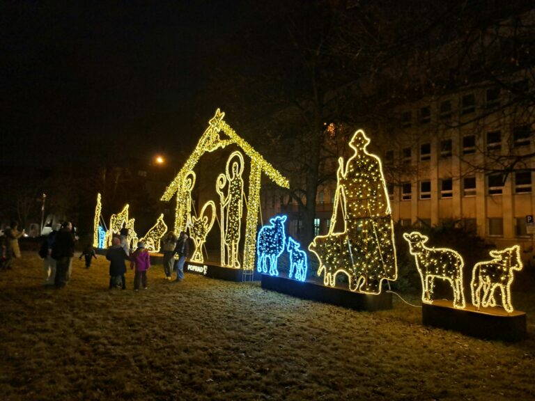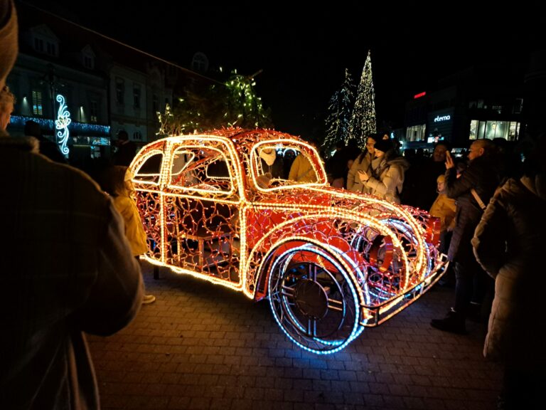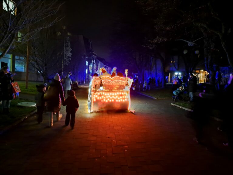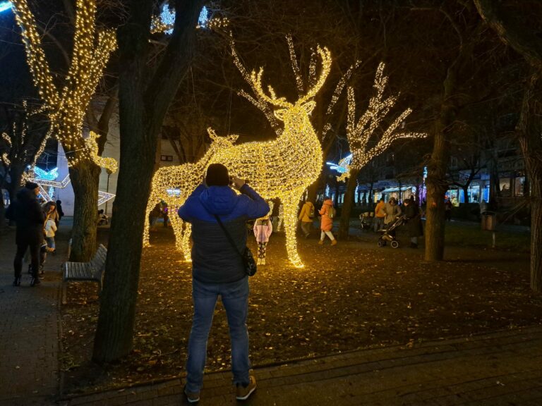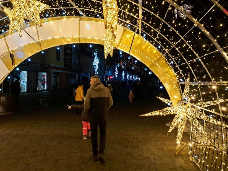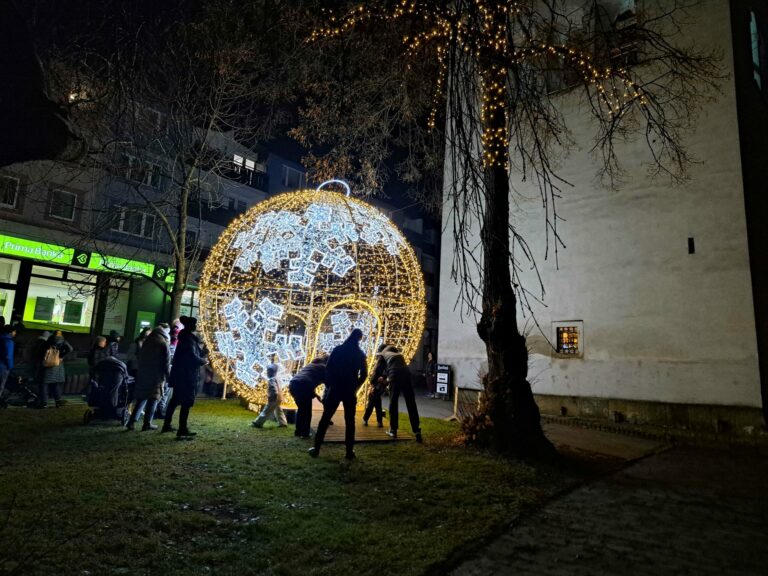 Vianočná výzdoba v Poprade, rozsvietená pri príležitosti príchodu Mikulášskeho sprievodu na saniach. Poprad, 5. december 2024. Foto: SITA/Mária Frisová.