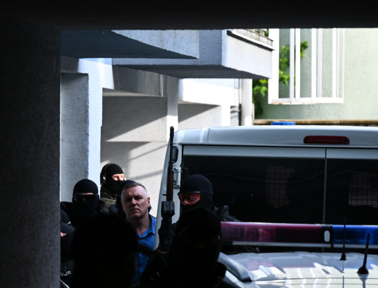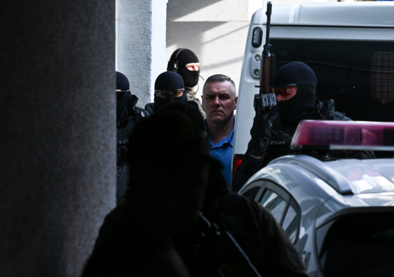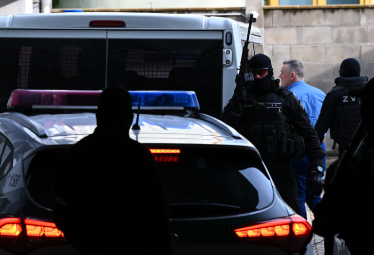 Eskorta privádza odsúdeného Mikuláša Černáka na verejné zasadnutie v trestnej veci o návrhu na podmienečné prepustenie odsúdeného z výkonu trestu odňatia slobody na Okresný súd Trnava, pracovisko Piešťany. Piešťany, 25. apríl 2024. Foto: archívne, SITA/Martin Medňanský.