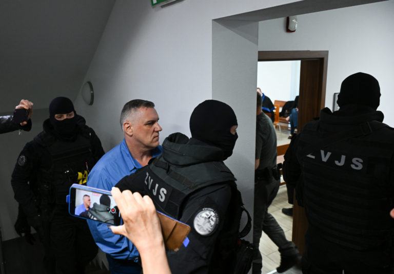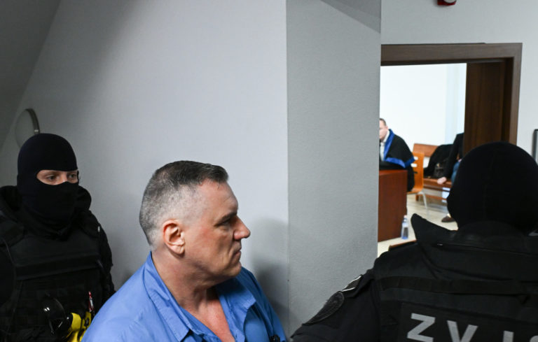 Odsúdený Mikuláš Černák (uprostred) počas príchodu v sprievode eskorty na verejné zasadnutie v trestnej veci o návrhu na podmienečné prepustenie odsúdeného z výkonu trestu odňatia slobody na Okresný súd Trnava, pracovisko Piešťany. Piešťany, 25. apríl 2024. Foto: SITA/Martin Medňanský.