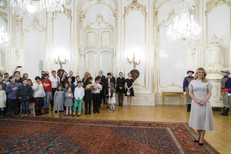 Prezidentka SR Zuzana Čaputová (uprostred) počas počas mikulášskeho prijatia detí v Prezidentskom paláci. Bratislava, 6. december 2019. Foto: SITA/Branislav Bibel