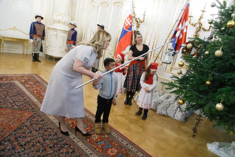 Prezidentka SR Zuzana Čaputová (vľavo) spolu s chlapcom symbolicky rozsvecujú stromček počas mikulášskeho prijatia detí prezidentkou SR v Prezidentskom paláci. Bratislava, 6. december 2019. Foto: SITA/Branislav Bibel