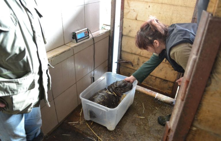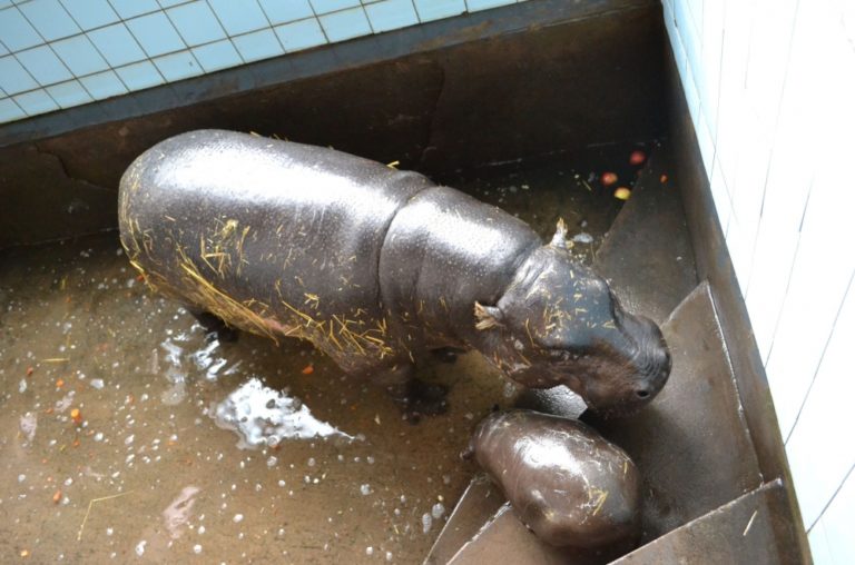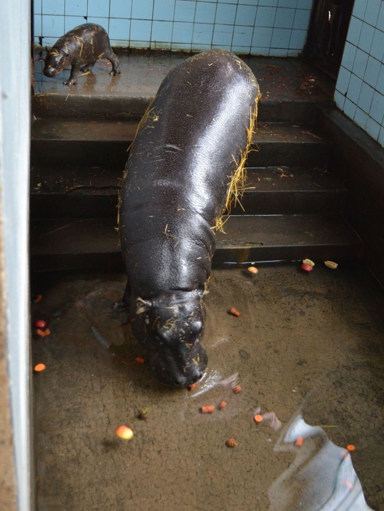 Samička hrošíka libérijského (uprostred dole) sa narodila v ranných hodinách ešte 24. januára. Hrošík liberijský (lat. Hexaprotodon liberiensis) sa od hrocha obojživelného odlišuje hlavne veľkosťou. Je menší, ľahší a nie je odkázaný na vodu v takej miere ako jeho najbližší príbuzný. Foto: SITA/ZOO Bratislava