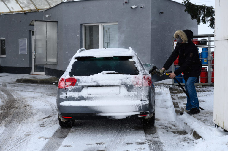 Obyvateľ Turca tankuje na čerpacej stanici pri Príbovciach počas mimoriadnej situácie v súvislosti so snežením na severe Slovenska. Príbovce, okres Martin, 4. február 2023. Foto: SITA/Milo Fabian