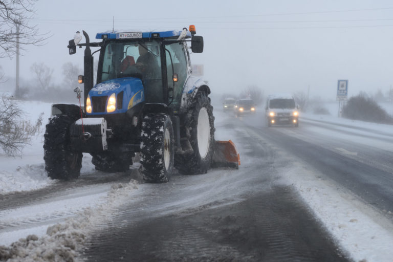 Traktor so snežným pluhom upravuje vozovku počas mimoriadnej situácie v súvislosti so snežením na severe Slovenska. Príbovce, okres Martin, 4. február 2023. Foto: SITA/Milo Fabian
