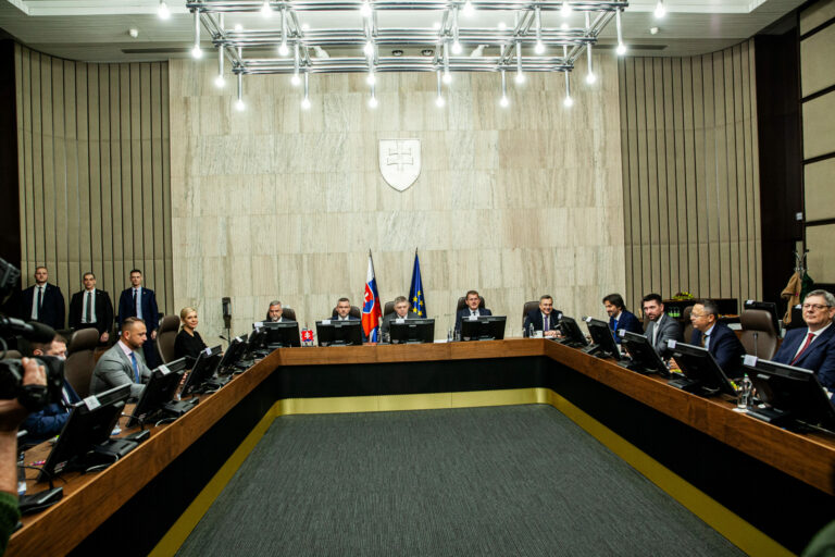 Zľava: Minister vnútra SR Matúš Šutaj Eštók, ministerka hospodárstva SR Denisa Saková, podpredseda NR SR Tibor Gašpar, prezident SR Peter Pellegrini, premiér SR Róbert Fico, dočasne poverený predseda NR SR Peter Žiga a podpredseda NR SR Andrej Danko, minister obrany SR Róber Kaliňák, minister pôdohospodárstva a rozvoja vidieka SR Richard Takáč, minister financií SR Ladislav Kamenický a minister spravodlivosti SR Boris Susko počas mimoriadneho zasadnutia bezpečnostnej rady SR v priestoroch Úradu vlády (ÚV SR). Bratislava, 23. január 2025. Foto: SITA/Tomáš Bokor