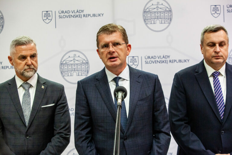 Zľava: Podpredseda Národnej rady (NR) SR Tibor Gašpar, podpredseda NR SR poverený výkonom právomoci predsedu parlamentu Peter Žiga a podpredseda NR SR Andrej Danko počas tlačovej konferencie po mimoriadnom zasadnutí Bezpečnostnej rady SR v priestoroch Úradu vlády (ÚV SR). Bratislava, 23. január 2025. Foto: SITA/Tomáš Bokor