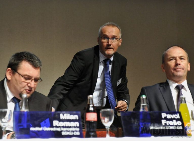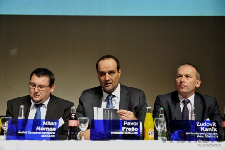 Zľava: Riaditeľ ústrednej kancelárie SDKÚ-DS Milan Roman, predseda strany Pavol Frešo a predseda poslaneckého klubu Ľudovít Kaník pred začiatkom mimoriadneho kongresu strany. Senica, 27. september 2014. Foto: SITA/Ján Slovák