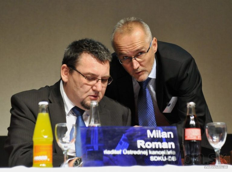 Zľava: Riaditeľ ústrednej kancelárie SDKÚ-DS Milan Roman a pokladník strany Ondrej Matej pred začiatkom mimoriadneho kongresu strany. Senica, 27. september 2014. Foto: SITA/Ján Slovák