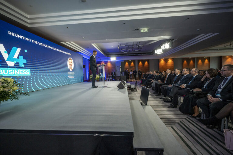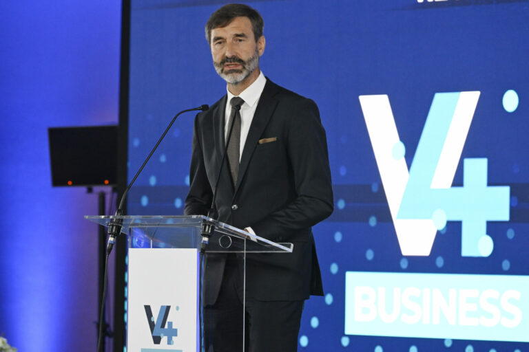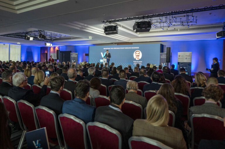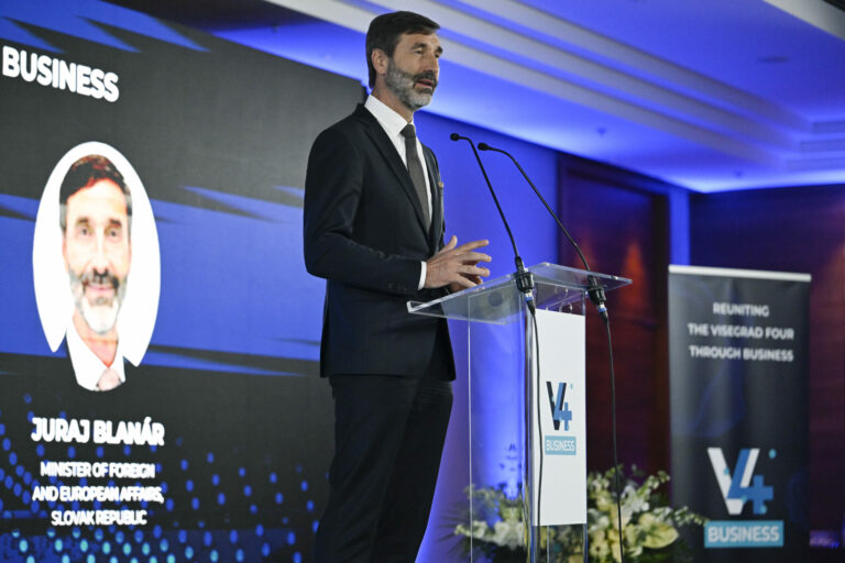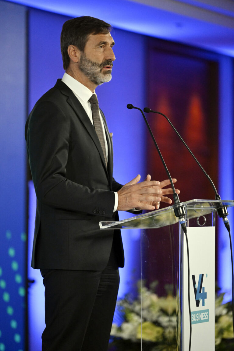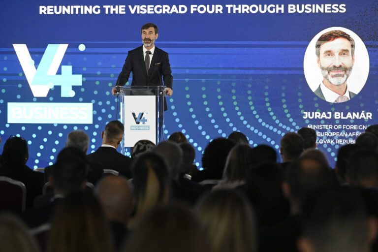 Minister zahraničných vecí a európskych záležitostí SR Juraj Blanár (uprostred v pozadí) počas príhovoru pri príležitosti 3. ročníka konferencie Visegrad 4 Business - biznis konferencie V4 v Budapešti. Budapešť, 14. november 2024. Foto: SITA/Milan Illík