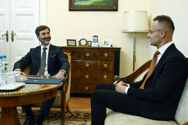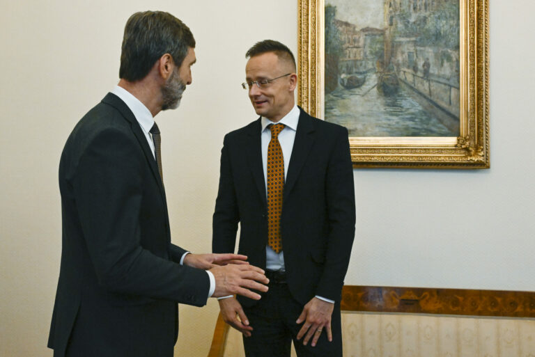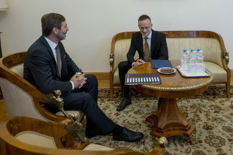 Zľava: Minister zahraničných vecí a európskych záležitostí SR Juraj Blanár a minister zahraničných vecí a obchodu Maďarska Péter Szijjártó počas bilaterálneho rokovania ministra zahraničia Slovenska na Ministerstve zahraničných vecí a obchodu Maďarska pri príležitosti 3. ročníka konferencie Visegrad 4 Business v Budapešti. Budapešť, 14. november 2024. Foto: SITA/Milan Illík