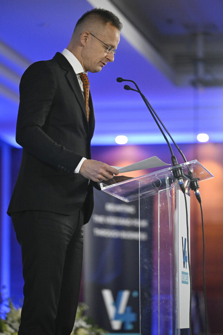 Minister zahraničných vecí a obchodu Maďarska Péter Szijjártó počas príhovoru pri príležitosti 3. ročníka konferencie Visegrad 4 Business - biznis konferencie V4 v Budapešti. Budapešť, 14. november 2024. Foto: SITA/Milan Illík