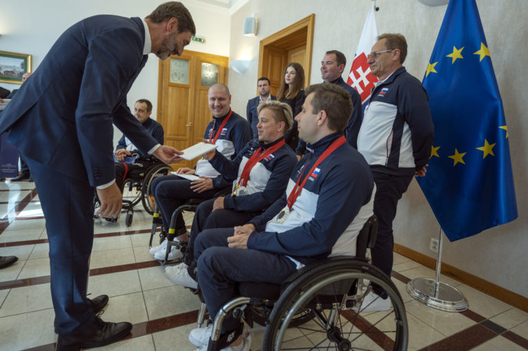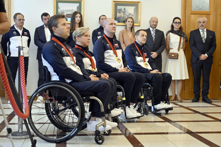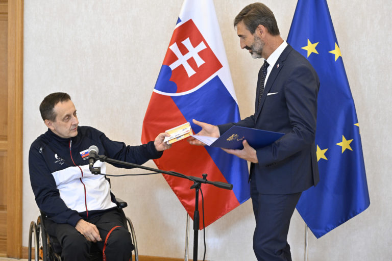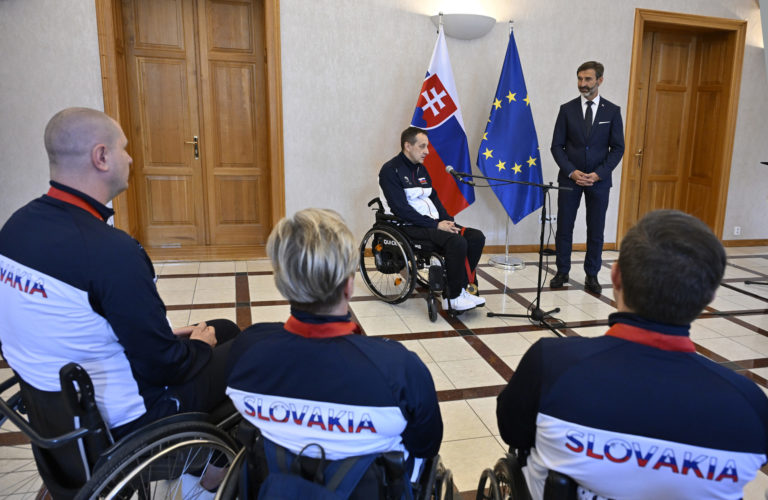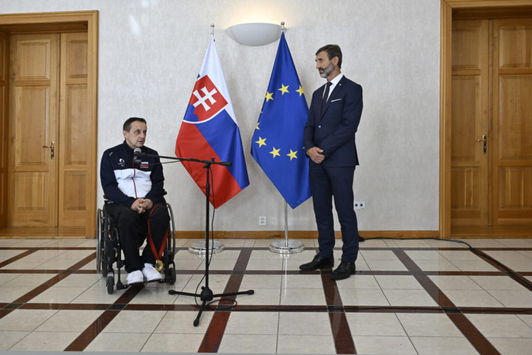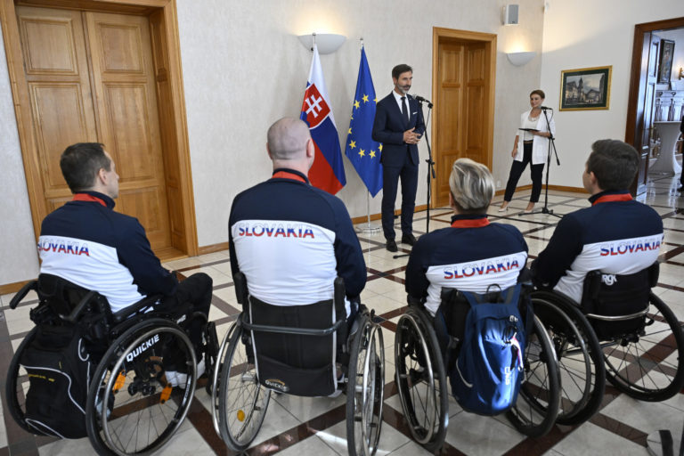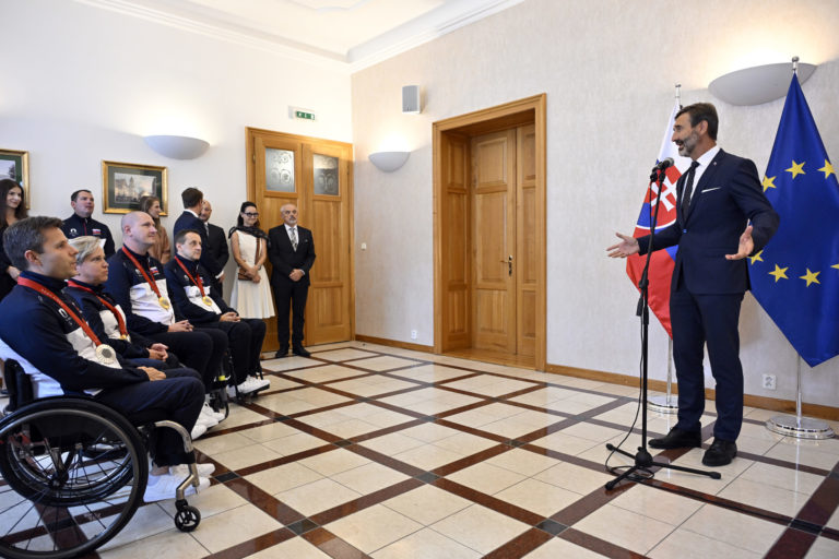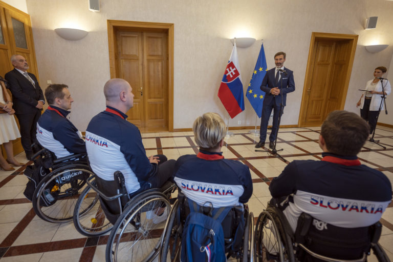 Minister zahraničných vecí a európskych záležitostí Slovenskej republiky Juraj Blanár (vľavo) počas prijatia slovenských športovcov a realizačného tímu, ktorí úspešne reprezentovali Slovensko na 17. paralympijských hrách v Paríži, v Palugyayovom paláci v Bratislave. Bratislava, 10. august 2024. Foto: SITA/Milan Illík.
