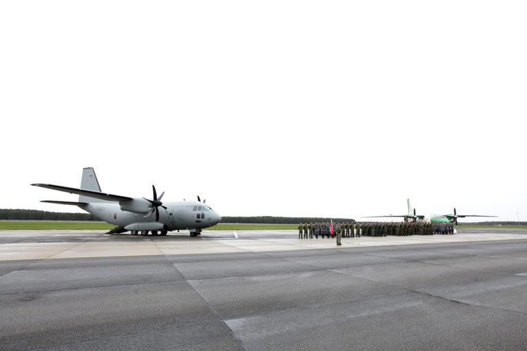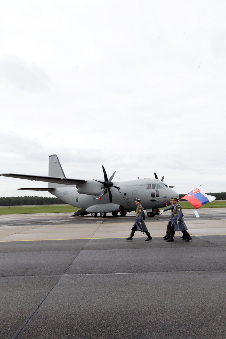 Pohľad na prvé z dvoch lietadiel Spartan, ktoré minister obrany SR slávnostne odovzdal do užívania vojakom v priestoroch Dopravného krídla generála M. R. Štefánika v Kuchyni. Nový Spartan C-27J prepraví okrem 3-člennej posádky 46 profesionálnych vojakov. Bratislava, 31. október 2017. Foto: SITA/MO SR