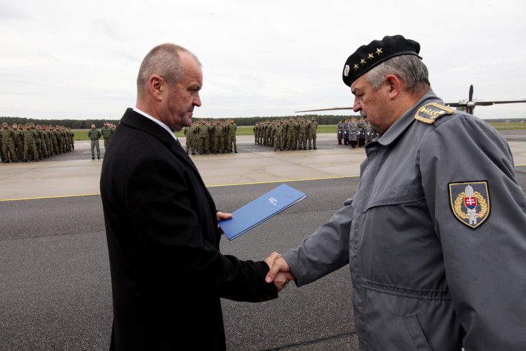 Zľava: Minister obrany SR Peter Gajdoš a náčelník Generálneho štábu OS SR Milan Maxim počas slávnostného odovzdávania prvého z dvoch lietadiel Spartan do užívania vojakom v priestoroch Dopravného krídla generála M. R. Štefánika v Kuchyni. Nový Spartan C-27J prepraví okrem 3-člennej posádky 46 profesionálnych vojakov. Bratislava, 31. október 2017. Foto: SITA/MO SR