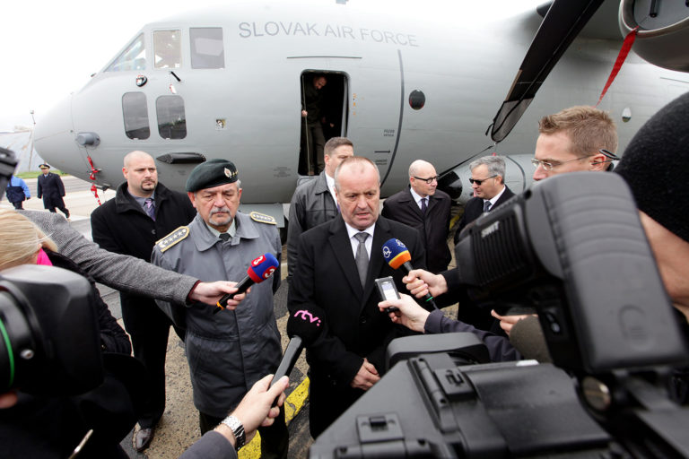 Sprava v popredí: Minister obrany SR Peter Gajdoš a náčelník Generálneho štábu OS SR Milan Maxim počas brífingu pri príležitosti slávnostného odovzdávania prvého z dvoch lietadiel Spartan do užívania vojakom v priestoroch Dopravného krídla generála M. R. Štefánika v Kuchyni. Nový Spartan C-27J prepraví okrem 3-člennej posádky 46 profesionálnych vojakov. Bratislava, 31. október 2017. Foto: SITA/MO SR