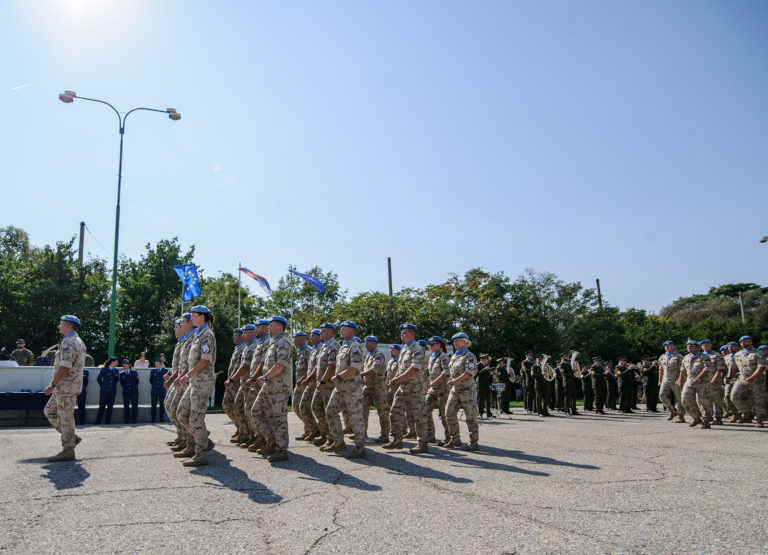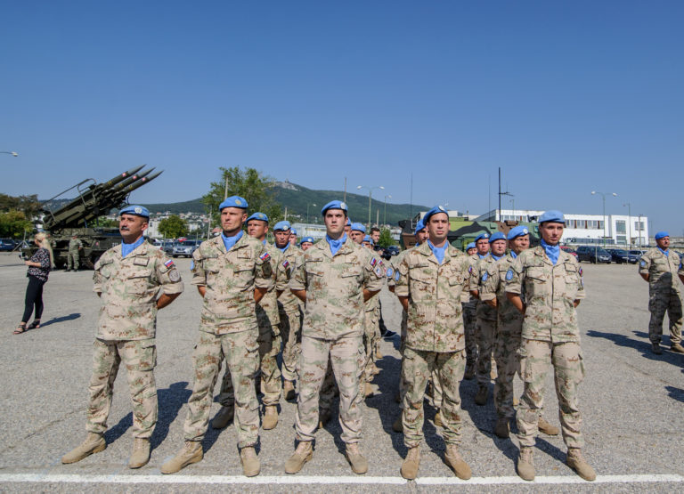 Vojaci, ktorí sa vrátili z pôsobenia v misii UNFICYP na Cypre poèas privítania ministrom obrany SR v priestoroch Protilietadlovej raketovej brigády VzS OS SR v Nitre. Nitra, 21. september 2018. Foto: SITA/Martin Havran