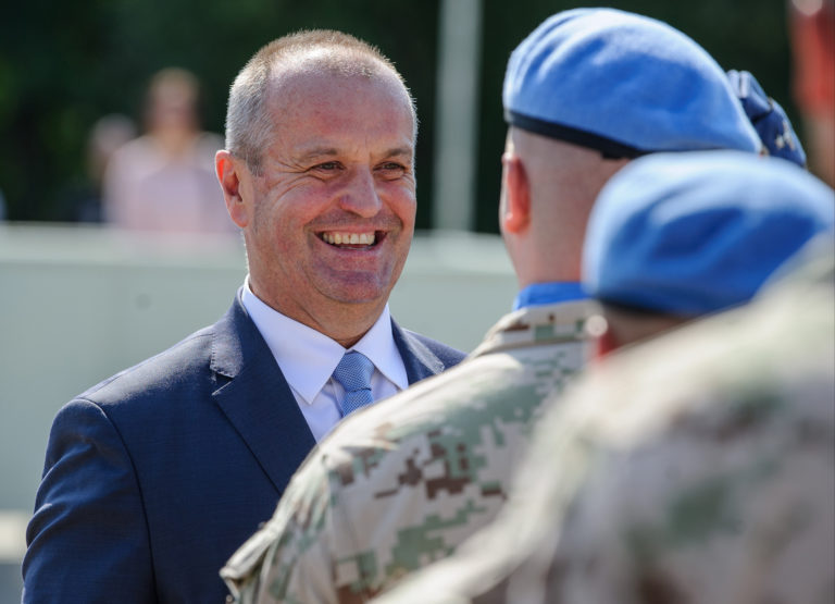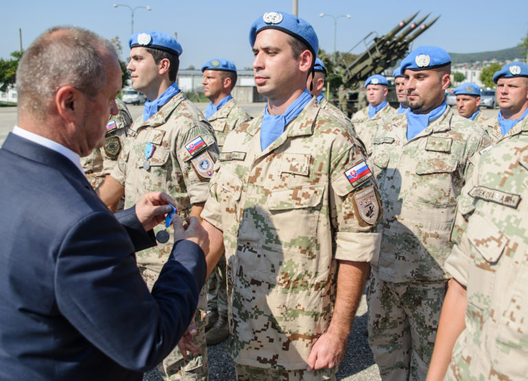 Minister obrany Peter Gajdoš (vľavo) privítal vojakov, ktorí sa vrátili z pôsobenia v misii UNFICYP na Cypre v priestoroch Protilietadlovej raketovej brigády VzS OS SR v Nitre. Nitra, 21. september 2018. Foto: SITA/Martin Havran