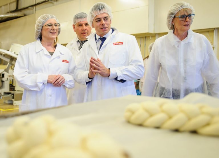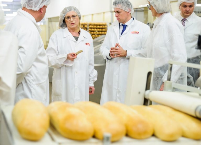 Ministerka pôdohospodárstva a rozvoja vidieka SR Gabriela Matečná (vľavo) a manažér pekárenskej divízie Penam Slovakia Vladislav Baričák (tretí zľava) počas návštevy ministerky v pekárni Penam Slovakia. Nitra, 19. apríl 2018. Foto: SITA/Martin Havran