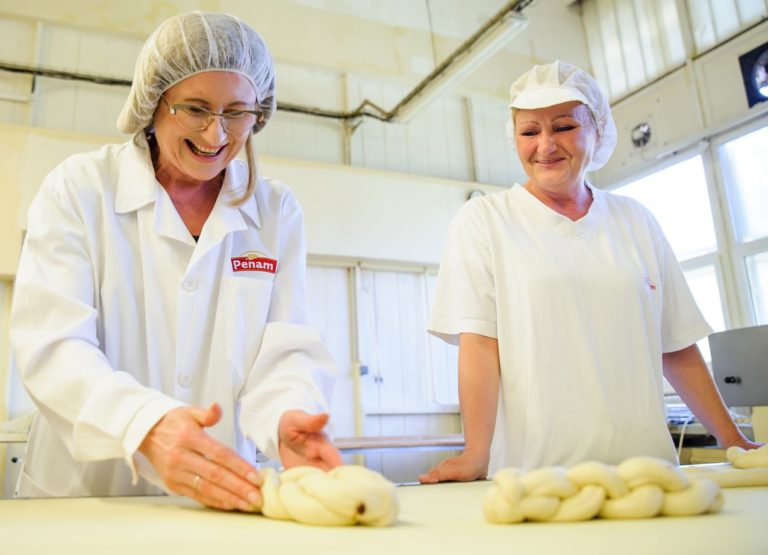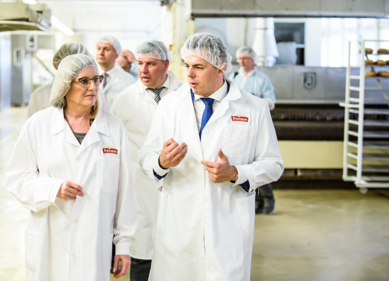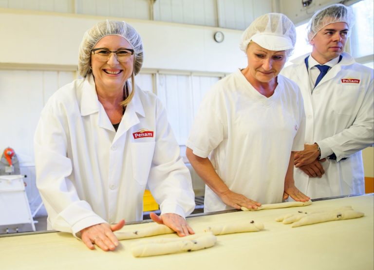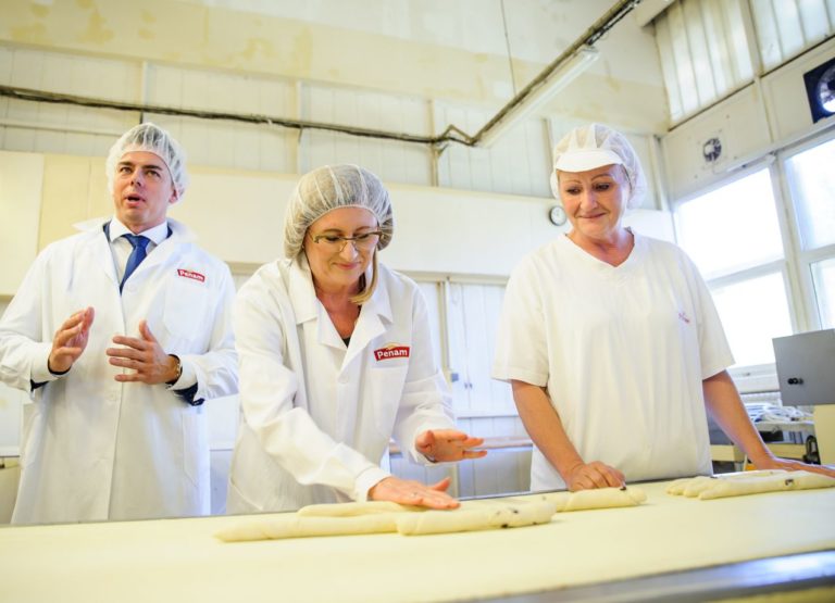 Ministerka pôdohospodárstva a rozvoja vidieka SR Gabriela Matečná (uprostred) a manažér pekárenskej divízie Penam Slovakia Vladislav Baričák (vľavo) počas návštevy ministerky v pekárni Penam Slovakia. Nitra, 19. apríl 2018. Foto: SITA/Martin Havran