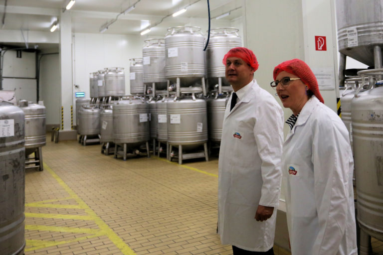 Zľava: Generálny manažér spoločnosti Zvolenská mliekareň Juraj Blada a ministerka pôdohospodárstva a rozvoja vidieka SR Gabriela Matečná počas prehliadky výrobných priestorov Zvolenskej mliekarne. Zvolen, 21. september 2018. Foto: SITA/Peter Rusko