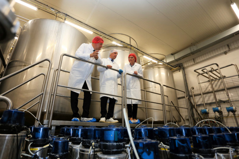 Zľava: Generálny riaditeľ Sekcie potravinárstva a obchodu MPaRV SR Milan Lapšanský, generálny manažér spoločnosti Zvolenská mliekareň Juraj Blada a ministerka pôdohospodárstva a rozvoja vidieka SR Gabriela Matečná počas prehliadky výrobných priestorov Zvolenskej mliekarne. Zvolen, 21. september 2018. Foto: SITA/Peter Rusko