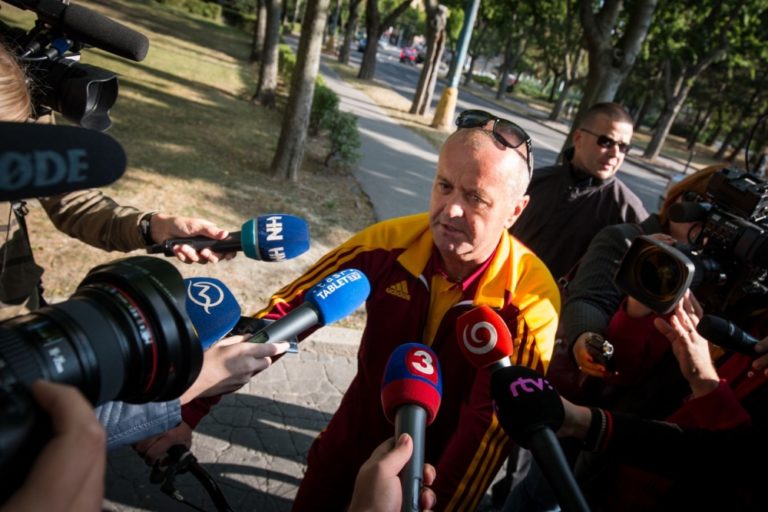 Minister obrany Peter Gajdoš (uprostred) počas rozhovoru pre médiá po príchode na rokovanie 27. schôdze vlády SR alternatívnou dopravou v rámci Európskeho týždňa mobility. Bratislava, 21. september 2016. Foto: SITA/Marek Mrviš
