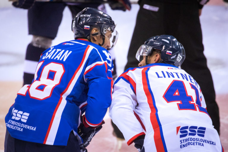 Zľava: Hokejisti Miroslav Šatan a Richard Lintner počas exhibičného rozlúčkového zápasu Miroslava Šatana na Zimnom štadióne Ondreja Nepelu. Bratislava, 18. december 2018. Foto: SITA/Diana Černáková