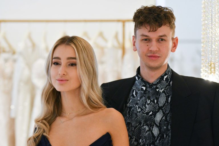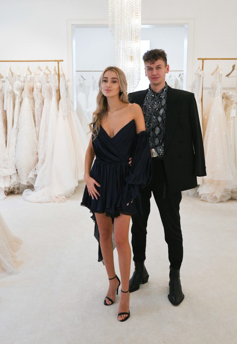 Sprava: Riaditeľ Miss Slovensko Michael Kováčik a Miss Slovensko 2020 Leona Novoberdaliu počas predstavenia modelu šiat, v ktorých bude reprezentovať Slovensko na 70. ročníku svetovej súťaže MISS WORLD v Portoriku. Bratislava, 9. november 2021. Foto: SITA/Martin Medňanský