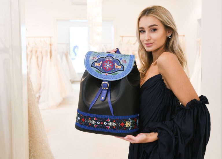Miss Slovensko 2020 Leona Novoberdaliu prezentuje ruksak ako národný dar od dizajnérky Dajana Rodriguez počas predstavenia modelov šiat, v ktorých bude reprezentovať Slovensko na 70. ročníku svetovej súťaže MISS WORLD v Portoriku. Bratislava, 9. november 2021. Foto: SITA/Martin Medňanský