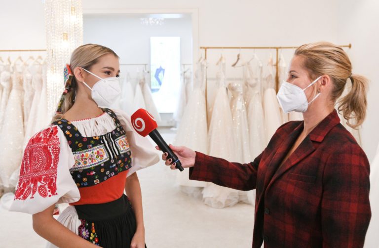 Miss Slovensko 2020 Leona Novoberdaliu (vľavo) v kroji z Očovej počas predstavenia modelov šiat, v ktorých bude reprezentovať Slovensko na 70. ročníku svetovej súťaže MISS WORLD v Portoriku. Bratislava, 9. november 2021. Foto: SITA/Martin Medňanský