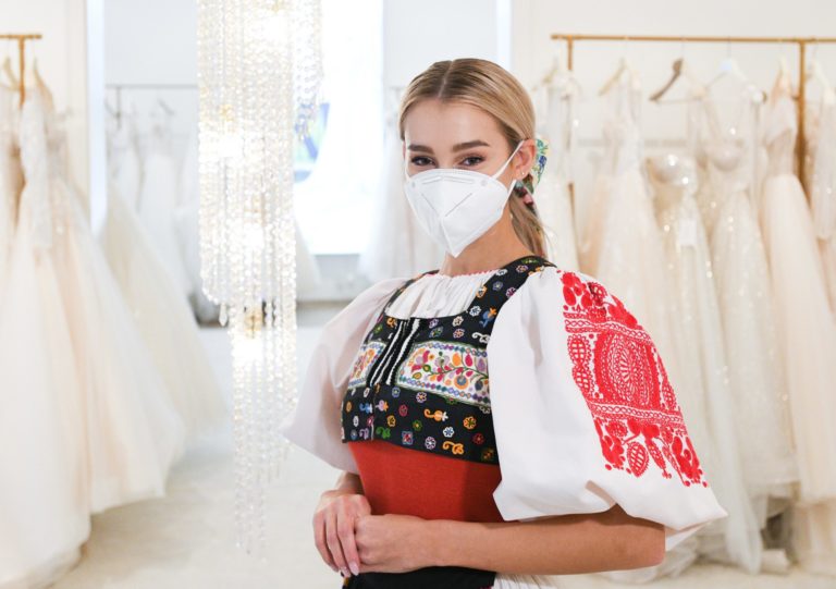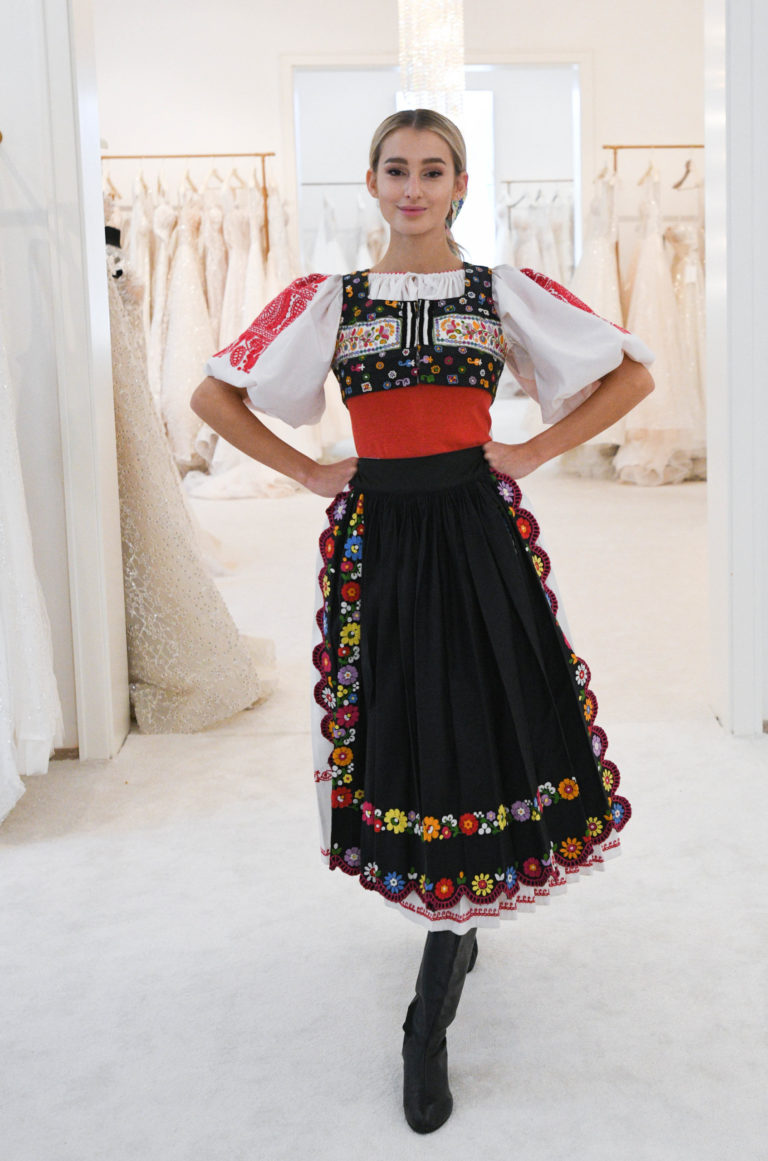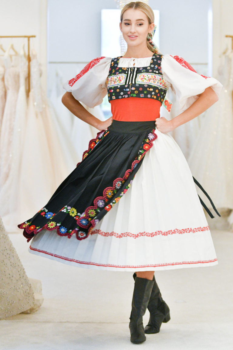 Miss Slovensko 2020 Leona Novoberdaliu v kroji z Očovej počas predstavenia modelov šiat, v ktorých bude reprezentovať Slovensko na 70. ročníku svetovej súťaže MISS WORLD v Portoriku. Bratislava, 9. november 2021. Foto: SITA/Martin Medňanský