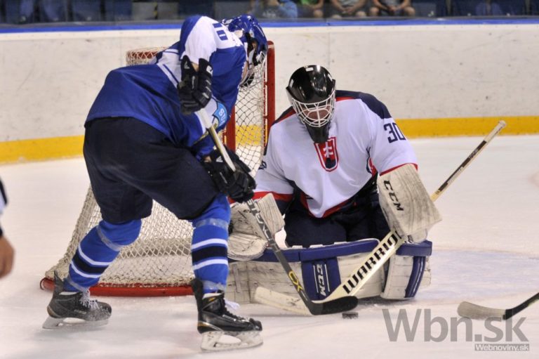Zľava: Erik Rajnohaa brankár Roman Durný zo Slovenska a Otto Koivula z Fínska v zápase B-skupiny turnaja hokejových výberov do 18 rokov Memoriál Ivana Hlinku Slovensko - Fínsko. Bratislava, 11. august 2015. Foto: SITA/Ján Slovák